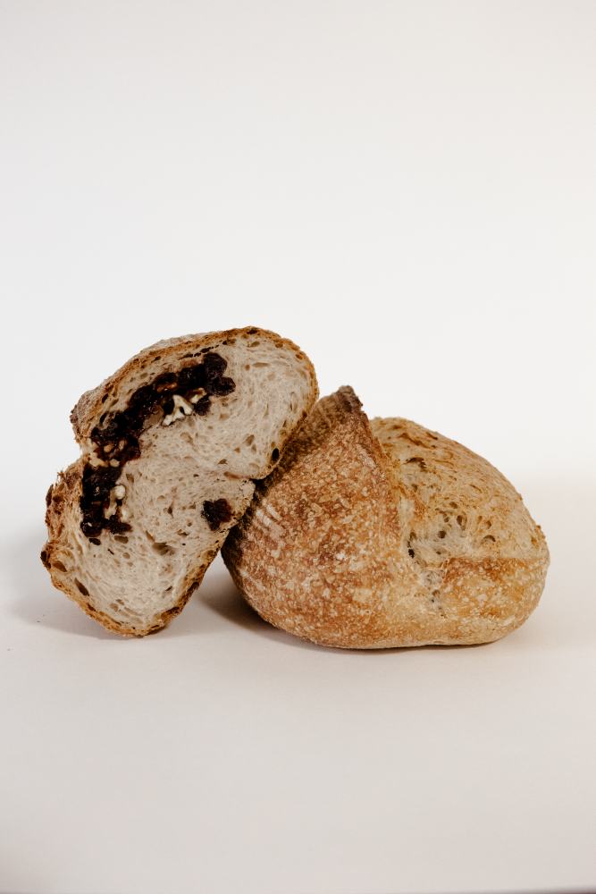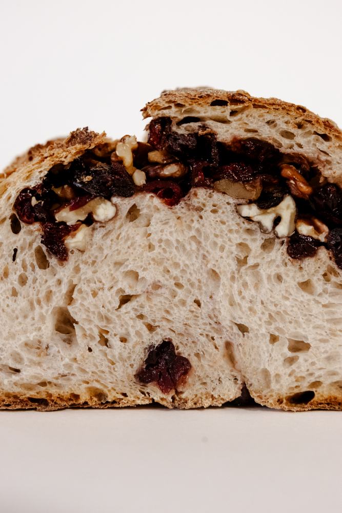 Skład: mąka 750, mąka graham 1850, mąka żytnia 720, woda, zakwas pszenno-razowy (woda, mąka pszenna 750, mąka graham 1850), sól, orzechy włoskie, żurawina suszona